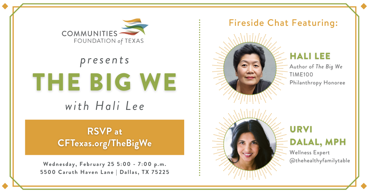 Join us at the Communities Foundation of Texas at 5PM for a conversation between Hali Lee and Urvi Dalal, MPH, discussing Lee’s book The Big We, which argues that the future of philanthropy is in community action.
